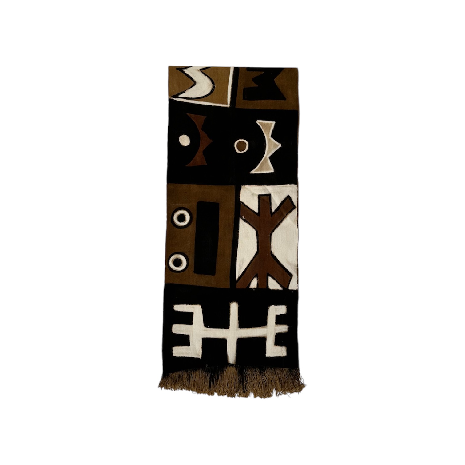 Le bogolan est une technique de teinture obtenu sur des bandes de tissu en coton blanc.